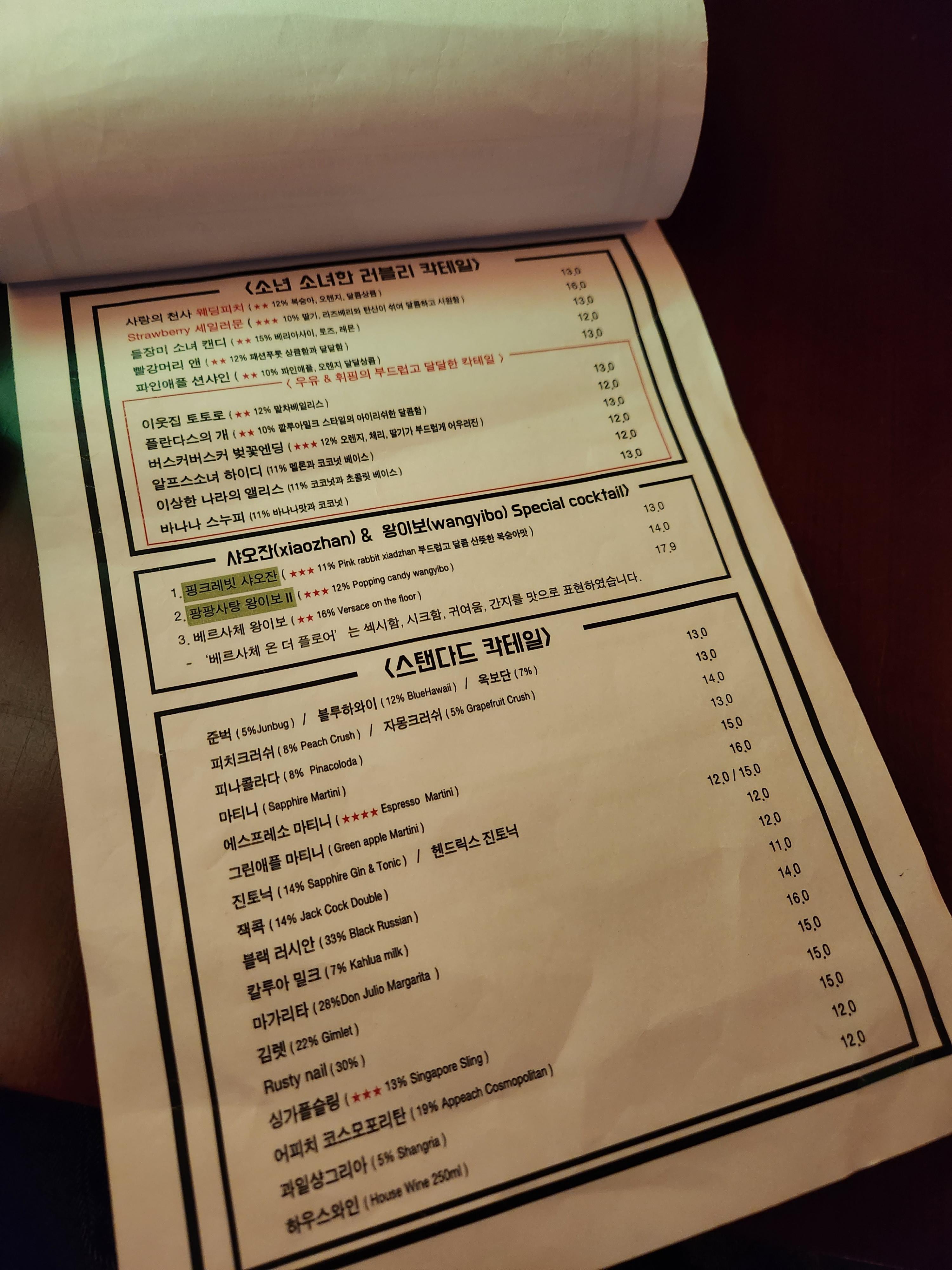 고민의 시간. 친구는 칵테일을 너무 좋아해서 자기가 늘 마시는 루틴이 있다고 했다. 피치크러시 다음엔 블랙러시안, 그다음엔... 뭐였는지 기억이 안 나네. 여하튼 그래도 이왕 여기서만 먹을 수 있는 맛을 시켜보라고 권유했다. 친구는 부드럽고 달콤 산뜻한 복숭아 맛의 '핑크래빗 샤오잔'(도수 11%)을 시켰고 알쓰인 나는 무알코올 칵테일로 라임, 만다린, 장미 맛의 '라일락꽃'을 주문했다.