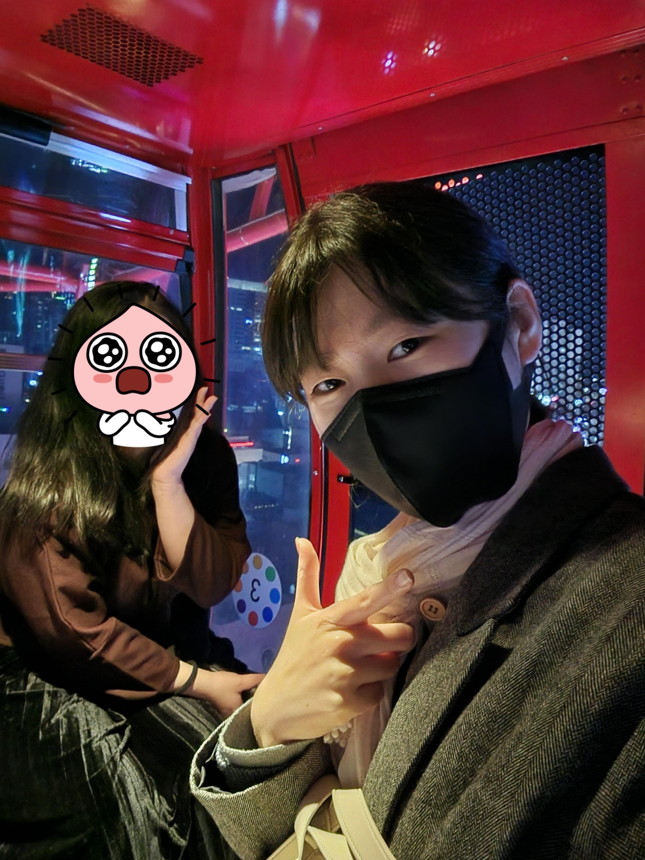 관람차 표는 1인당 6000원! 관람차는 천천히 올라갔지만 친구는 바람에 관람차가 흔들려서, 나는 점점 멀어지고 작아지는 건물들을 보는 게 좀 무서웠다ㅋㅋㅋㅋ큐ㅠㅠㅠ 관람차가 좀 내려가고 나서야 편하게 야경을 감상할 수 있었다. 사실 별 것 없는 도시의 풍경이지만 오랜만에 친구랑 새로운 경험을 하고 함께 있는 것이 마냥 좋았다.